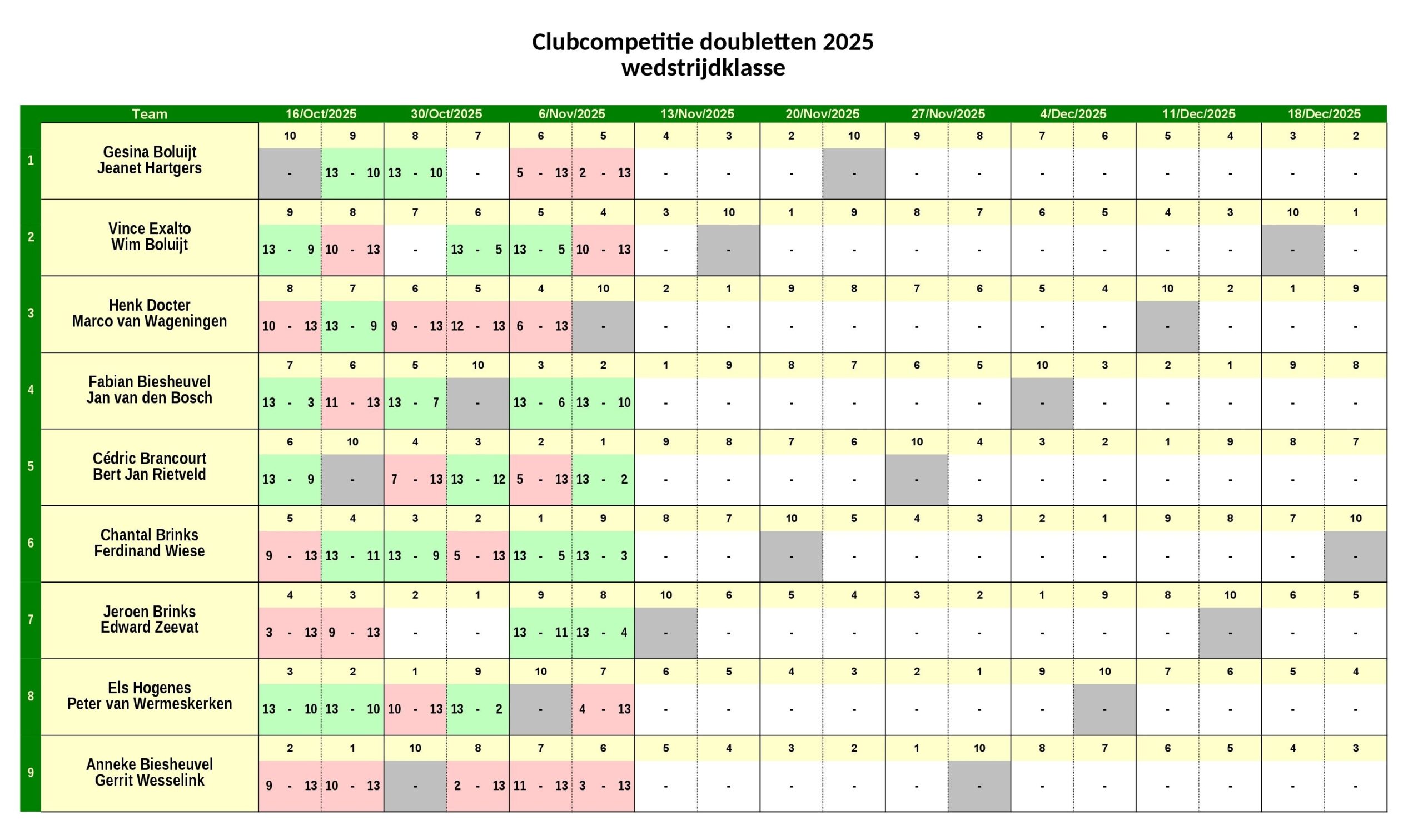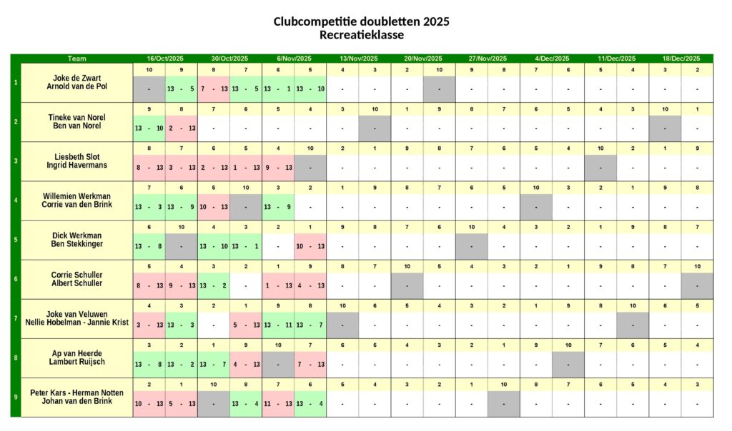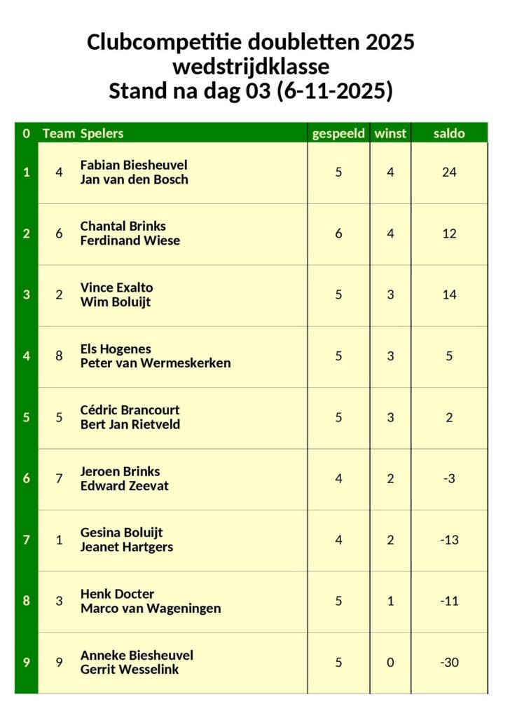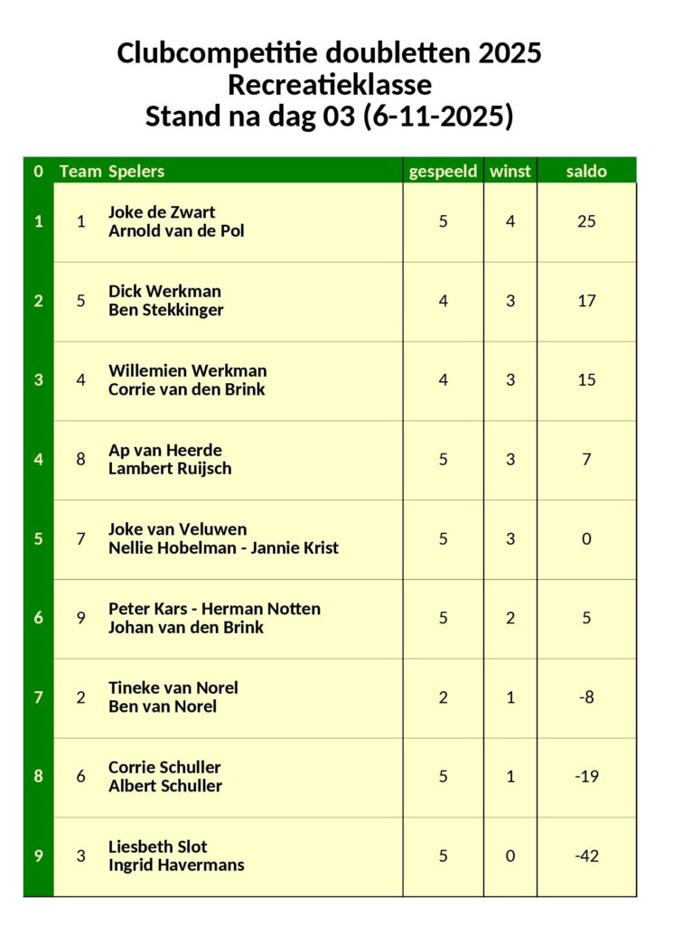 Club Competitie Doubletten – Stand na dag 3 (6-11-2025) November 8, 2025 Albert Schuller Share this: Click to share on Facebook (Opens in new window) Facebook Click to share on LinkedIn (Opens in new window) LinkedIn Click to share on X (Opens in new window) X