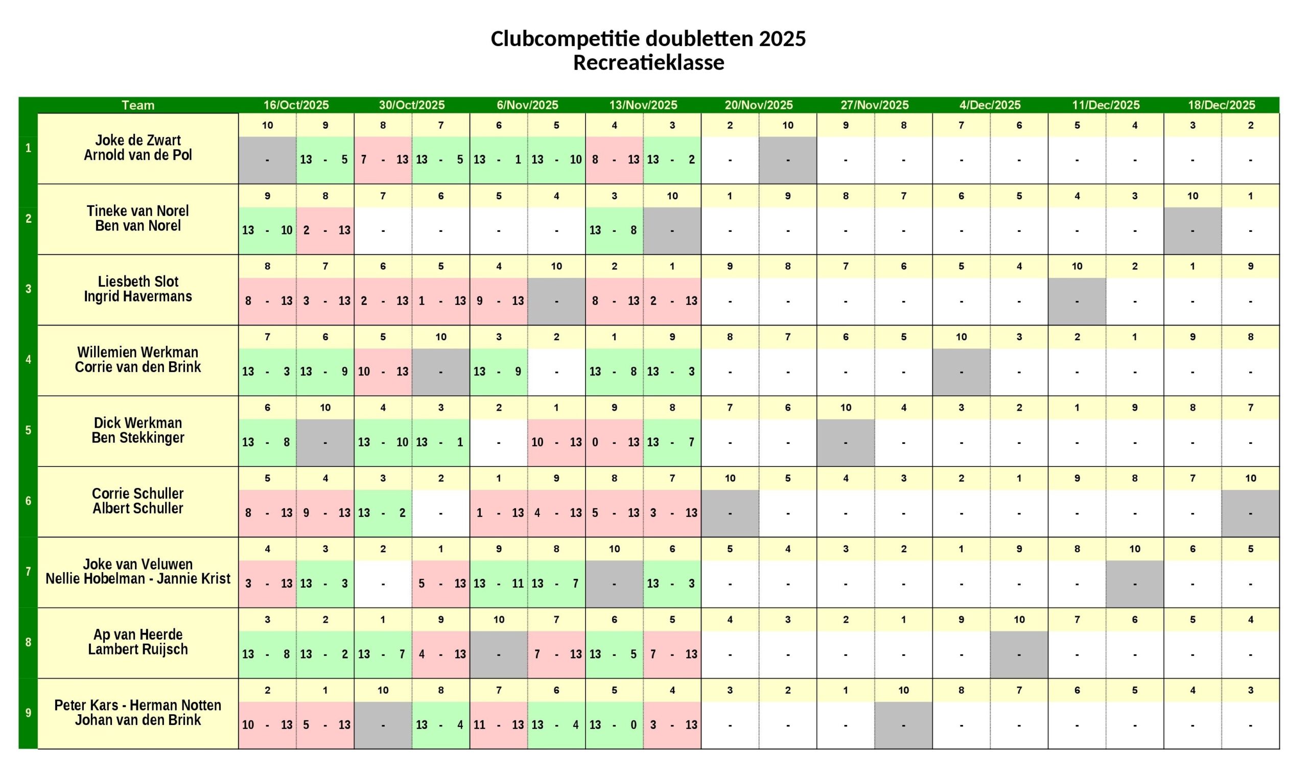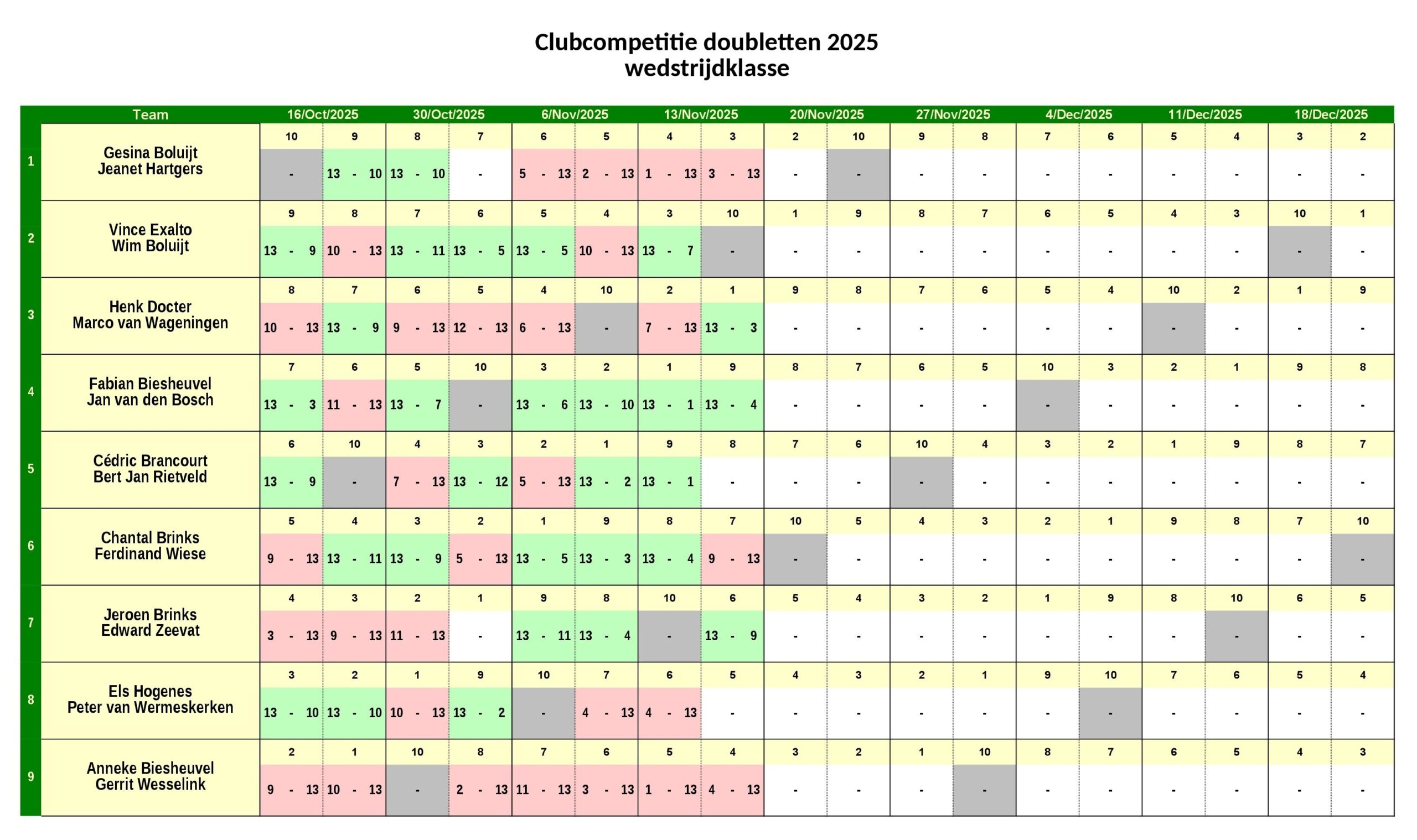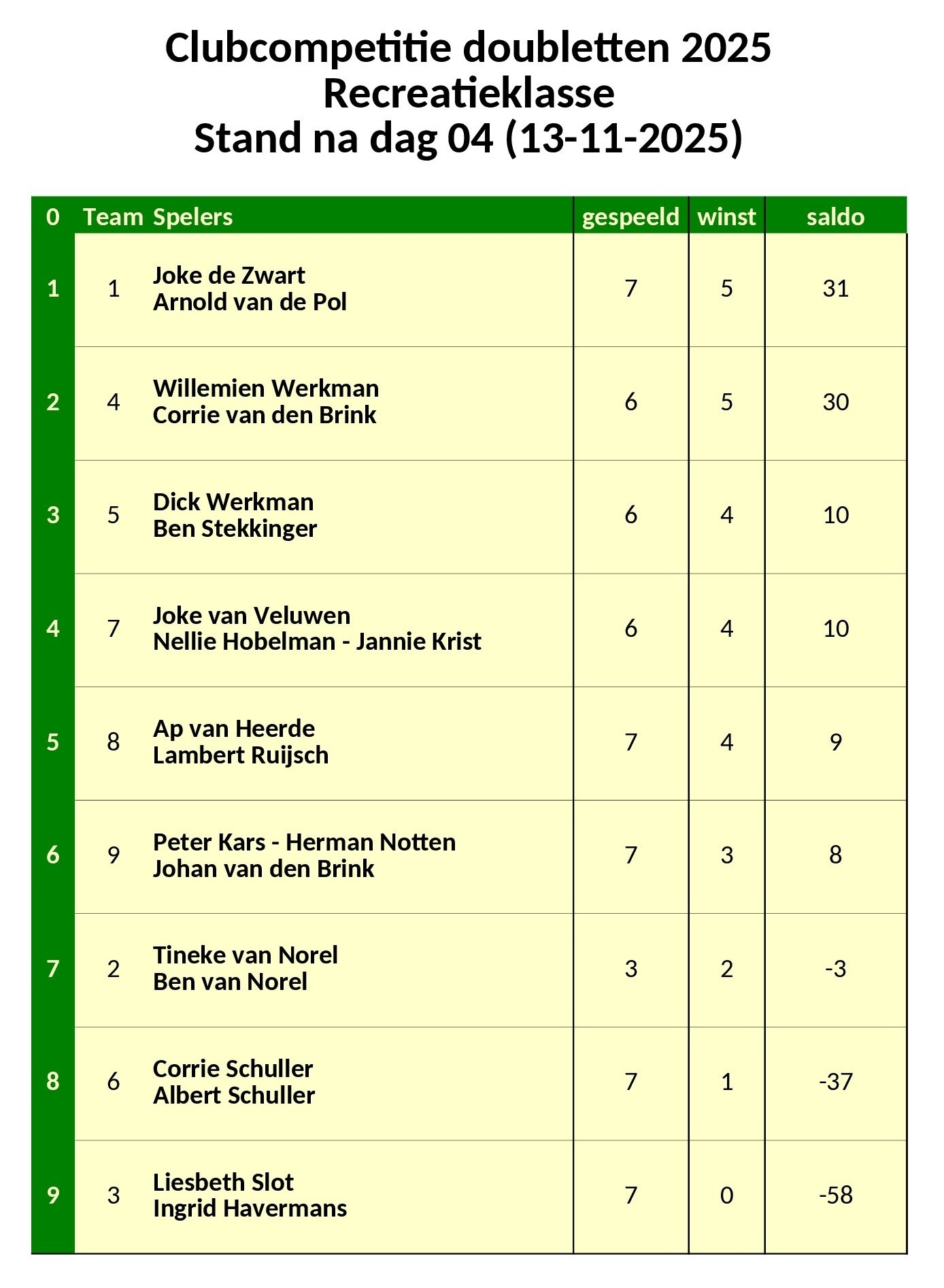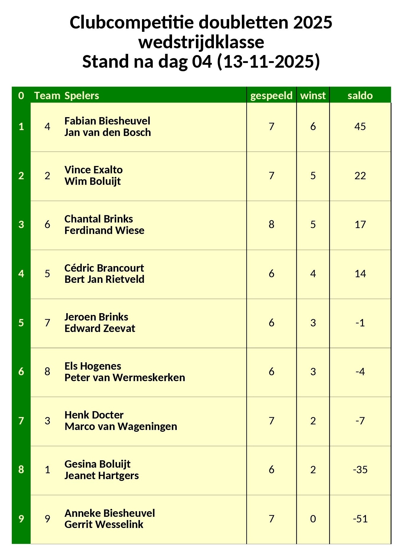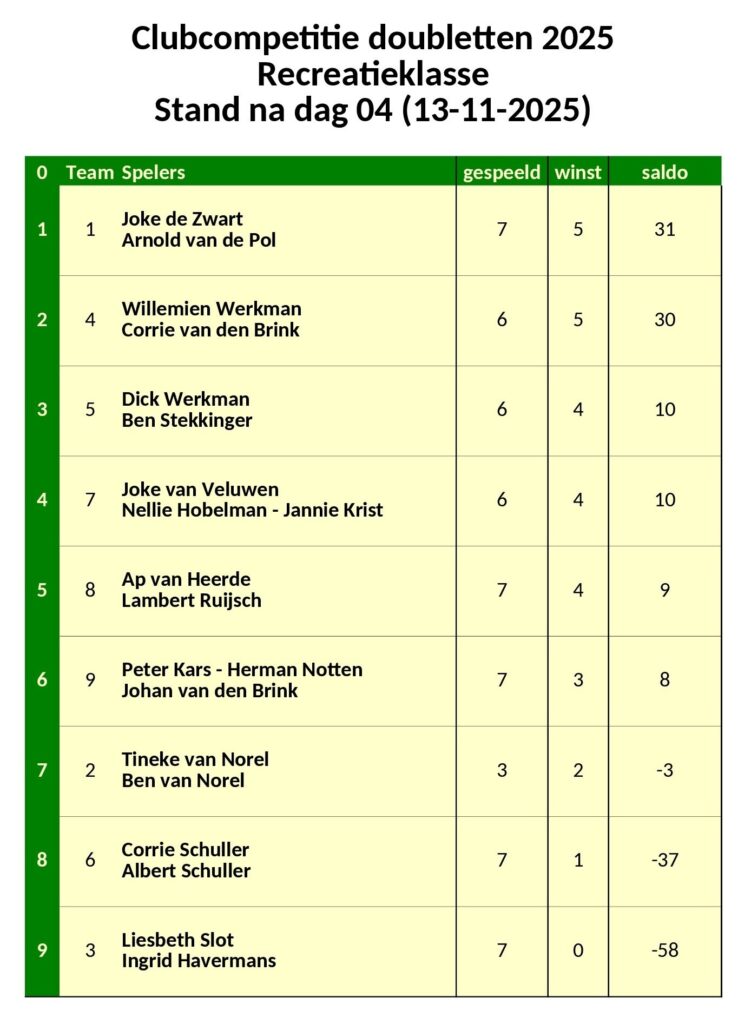 Club Competitie Doubletten – Stand na dag 4 (13-11-2025) November 14, 2025 Albert Schuller Share this: Click to share on Facebook (Opens in new window) Facebook Click to share on LinkedIn (Opens in new window) LinkedIn Click to share on X (Opens in new window) X
