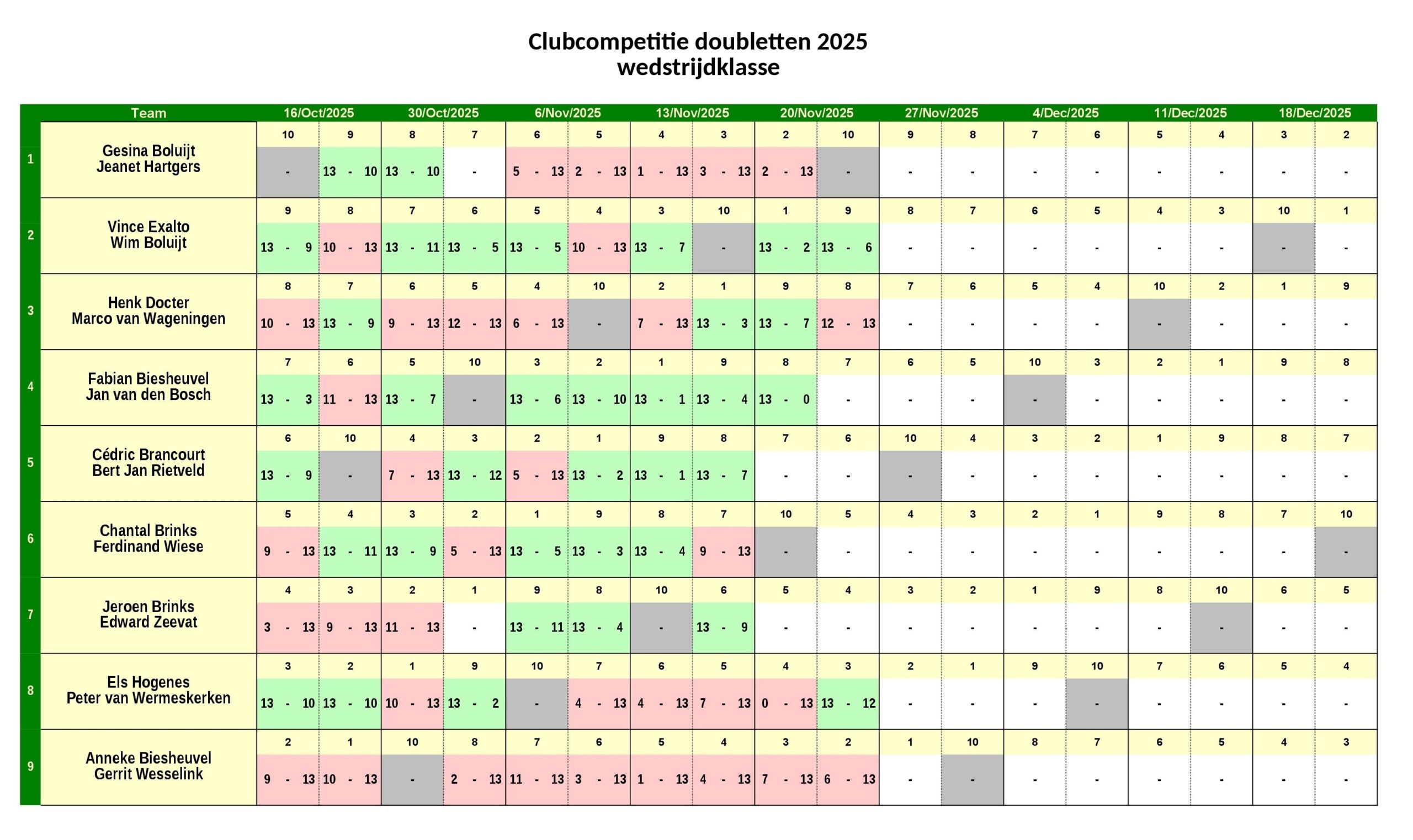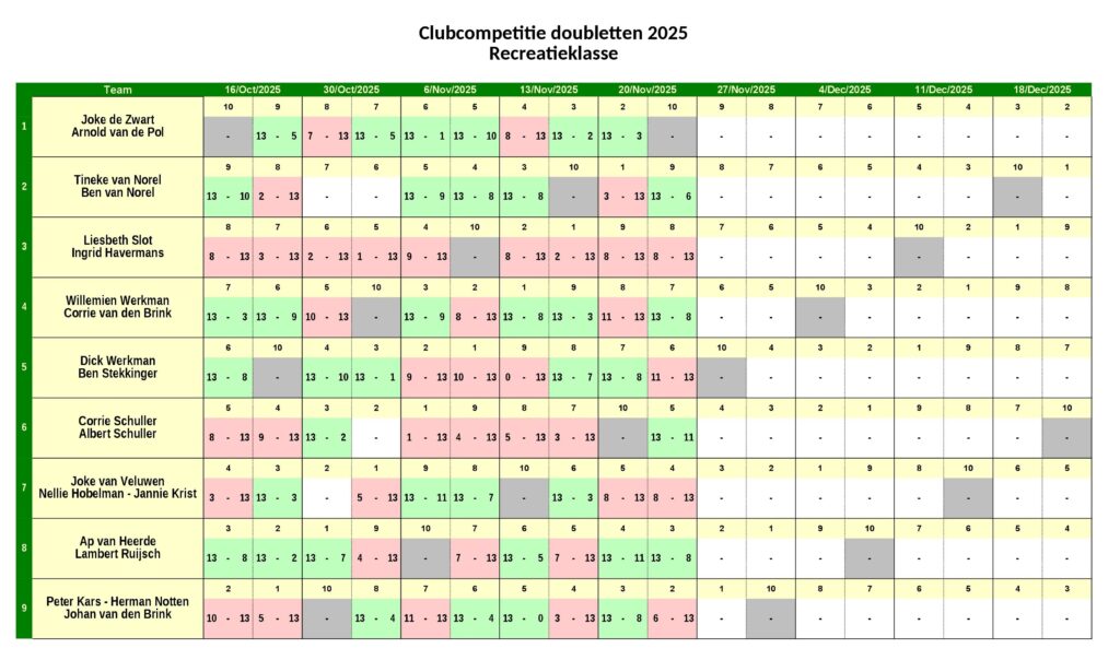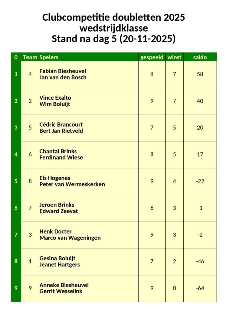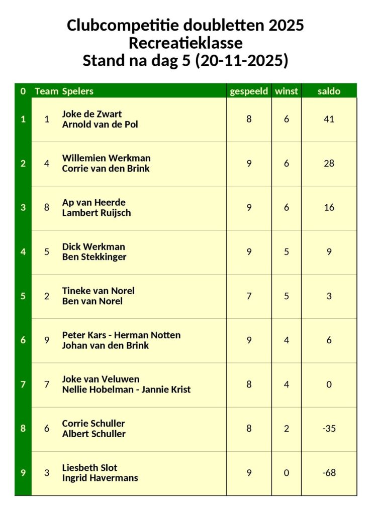 Club Competitie Doubletten – Stand na dag 5 (20-11-2025) November 21, 2025 Albert Schuller Share this: Click to share on Facebook (Opens in new window) Facebook Click to share on LinkedIn (Opens in new window) LinkedIn Click to share on X (Opens in new window) X