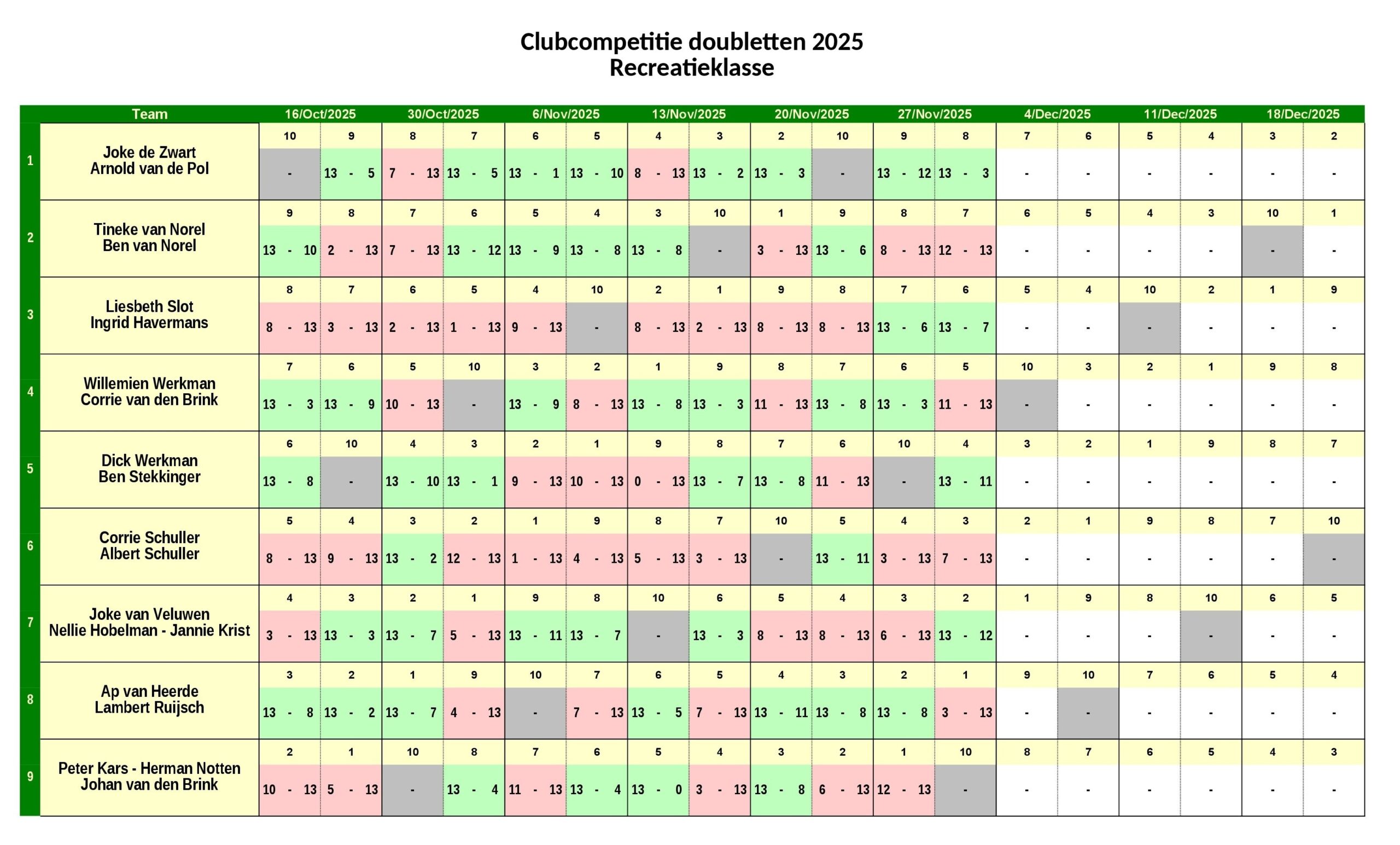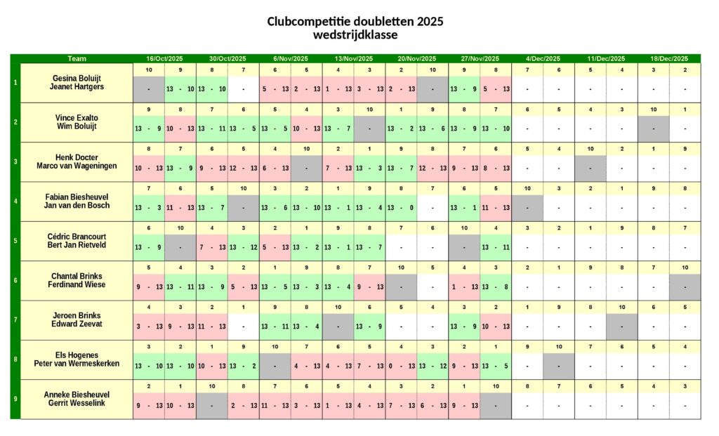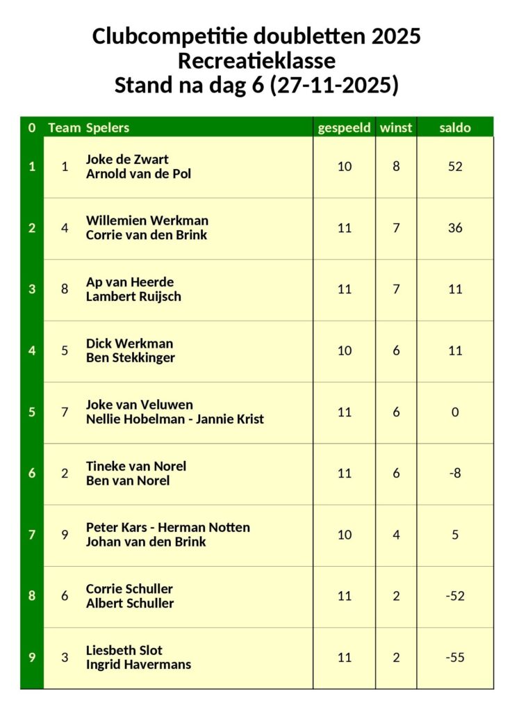 Club Competitie Doubletten – Stand na dag 6 (27-11-2025) November 28, 2025 Albert Schuller Share this: Click to share on Facebook (Opens in new window) Facebook Click to share on LinkedIn (Opens in new window) LinkedIn Click to share on X (Opens in new window) X