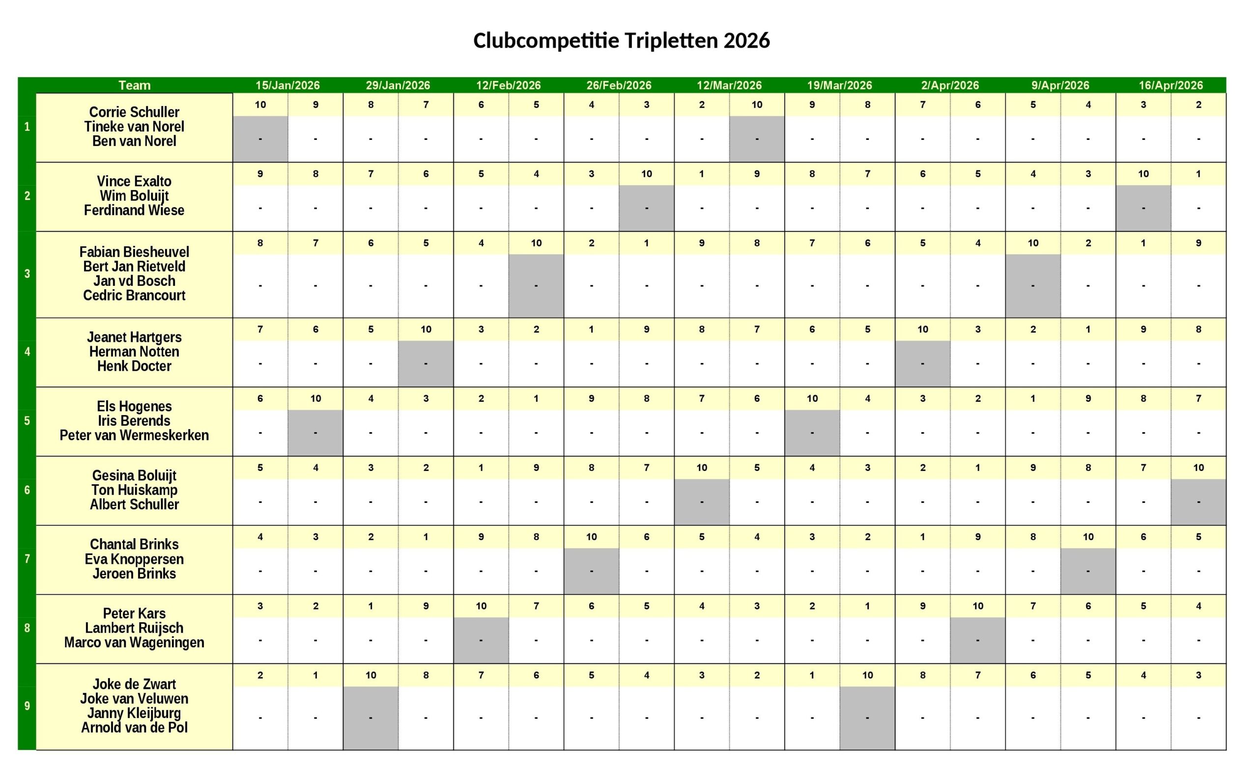 Wedstrijdschema Clubcompetitie Tripletten 2026 January 7, 2026 Albert Schuller Share this: Click to share on Facebook (Opens in new window) Facebook Click to share on LinkedIn (Opens in new window) LinkedIn Click to share on X (Opens in new window) X