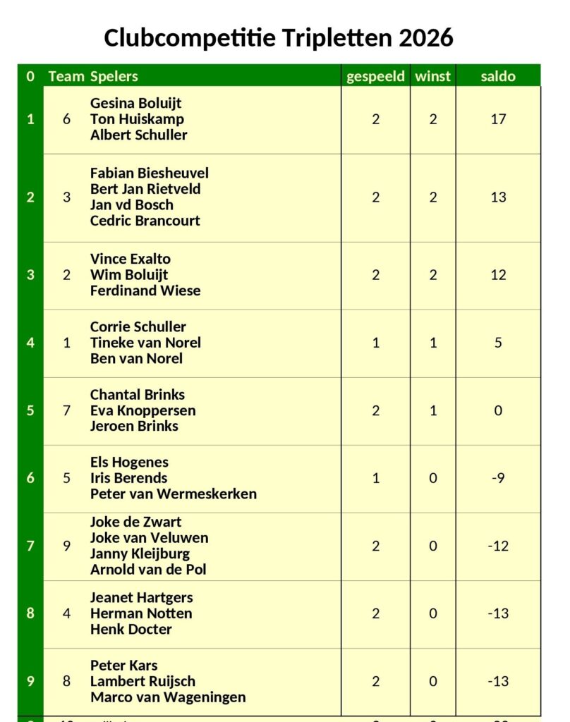 Clubcompetitie Tripletten 2026 – Stand na dag 1 (15-01-2026) January 16, 2026January 16, 2026 Albert Schuller Share this: Click to share on Facebook (Opens in new window) Facebook Click to share on LinkedIn (Opens in new window) LinkedIn Click to share on X (Opens in new window) X