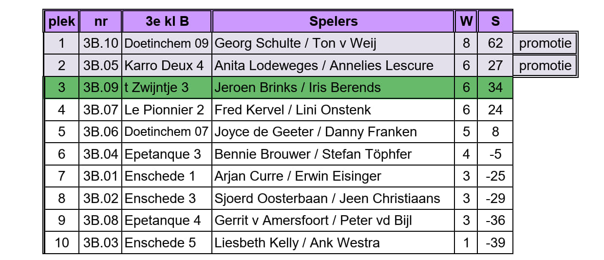 ‘t Zwijntje 3, had zich na een matige 1e dag goed hersteld en had uitzicht op een plek bij de eerste 2 in de 3e klasse, wat promotie in zou houden. Net als ’t Zwijntje 2 wisten zij jammer genoeg niet alle 3 de wedstrijden te winnen. De winst van 2 partijen betekende dat zij uiteindelijk als 3e in hun klasse eindigden en een promotie op een haardikte misten.
