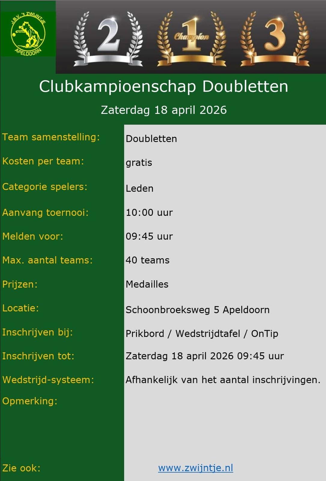 Clubkampioenschappen Doubletten 18 april 2026 March 9, 2026March 9, 2026 Albert Schuller Share this: Share on Facebook (Opens in new window) Facebook Share on LinkedIn (Opens in new window) LinkedIn Share on X (Opens in new window) X