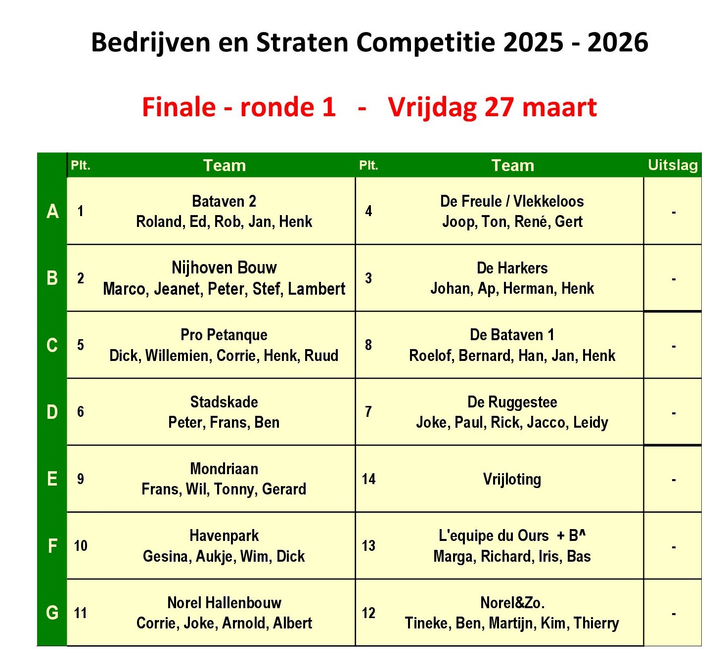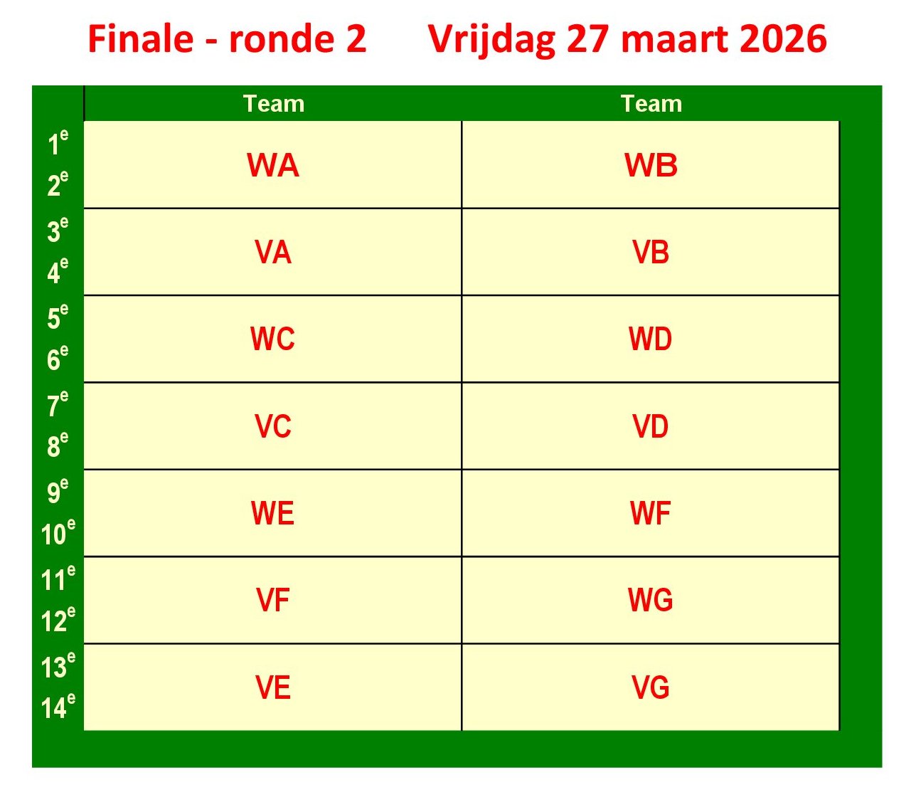 Wedstrijdschema Finale-avond Bedrijven en Straten Competitie 2026 March 23, 2026March 23, 2026 Albert Schuller Share this: Share on Facebook (Opens in new window) Facebook Share on LinkedIn (Opens in new window) LinkedIn Share on X (Opens in new window) X