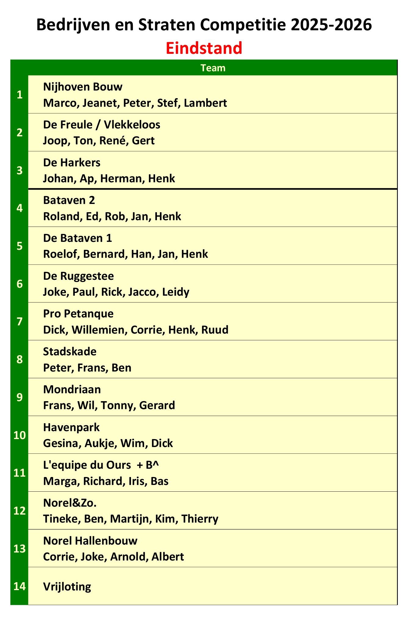 Door 14 teams is vanaf oktober met elkaar de strijd aangegaan voor de winst en zo’n hoog mogelijke eindklassering. Helaas moest door omstandigheden 1 team gedurende de competitie zich terugtrekken. De wedstrijden waren vaak spannend en soms pittig maar altijd in een sportieve en plezierige setting.